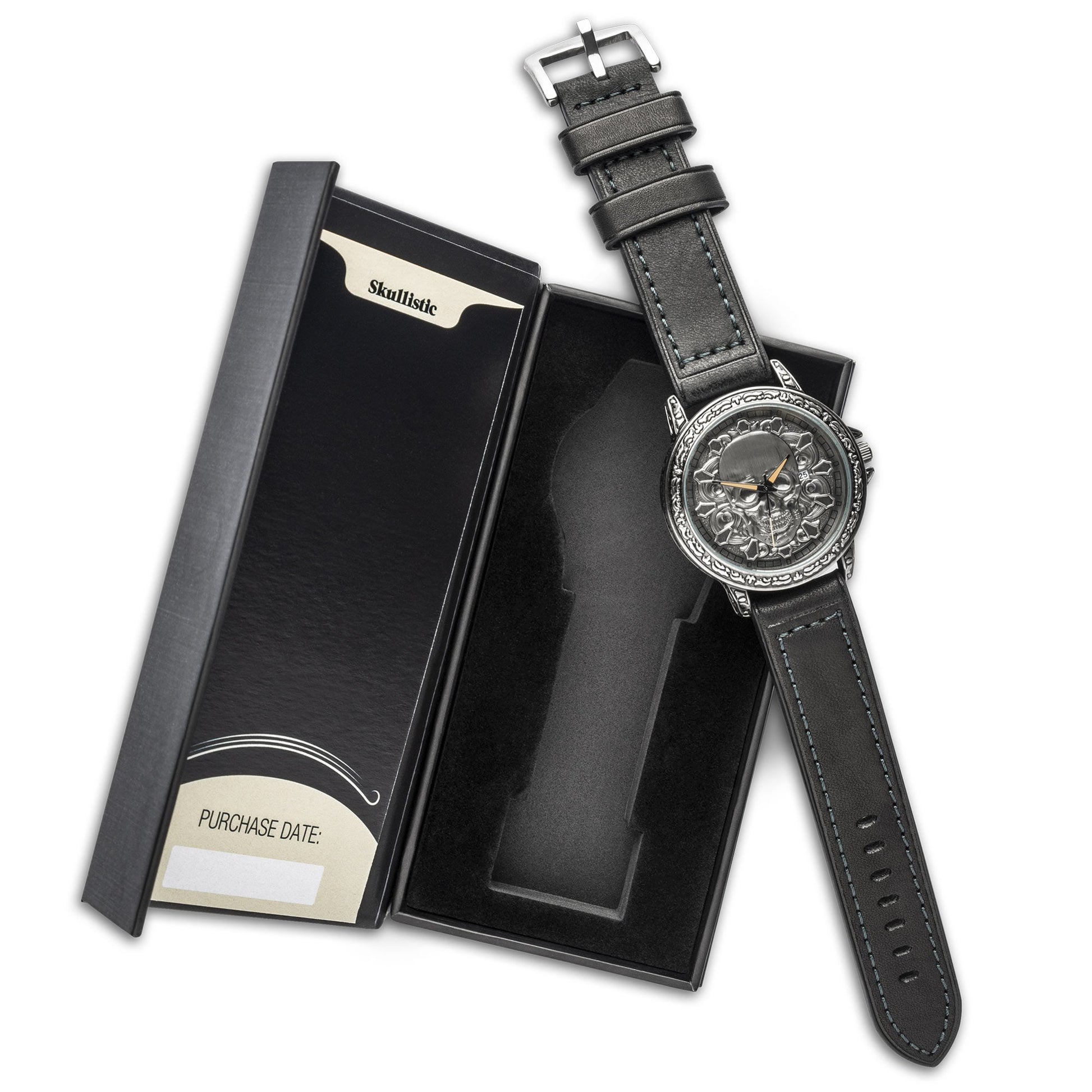 This unique skull watch features a stainless steel case and strap with unique 3D skull elements. Perfect gift for man or women who desires timepiece with an edge. Choose between metal band in matching silver color or genuine black leather band.