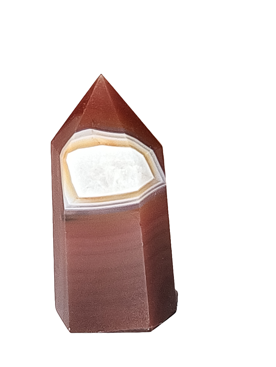 The Carnelian Agate Point is a powerful healing stone that balances the mind, body, and spirit by working on all chakras. It removes negative energy, allowing positivity to flow. This stone may aid in emotional healing and is commonly used during meditation to restore hope and enthusiasm.