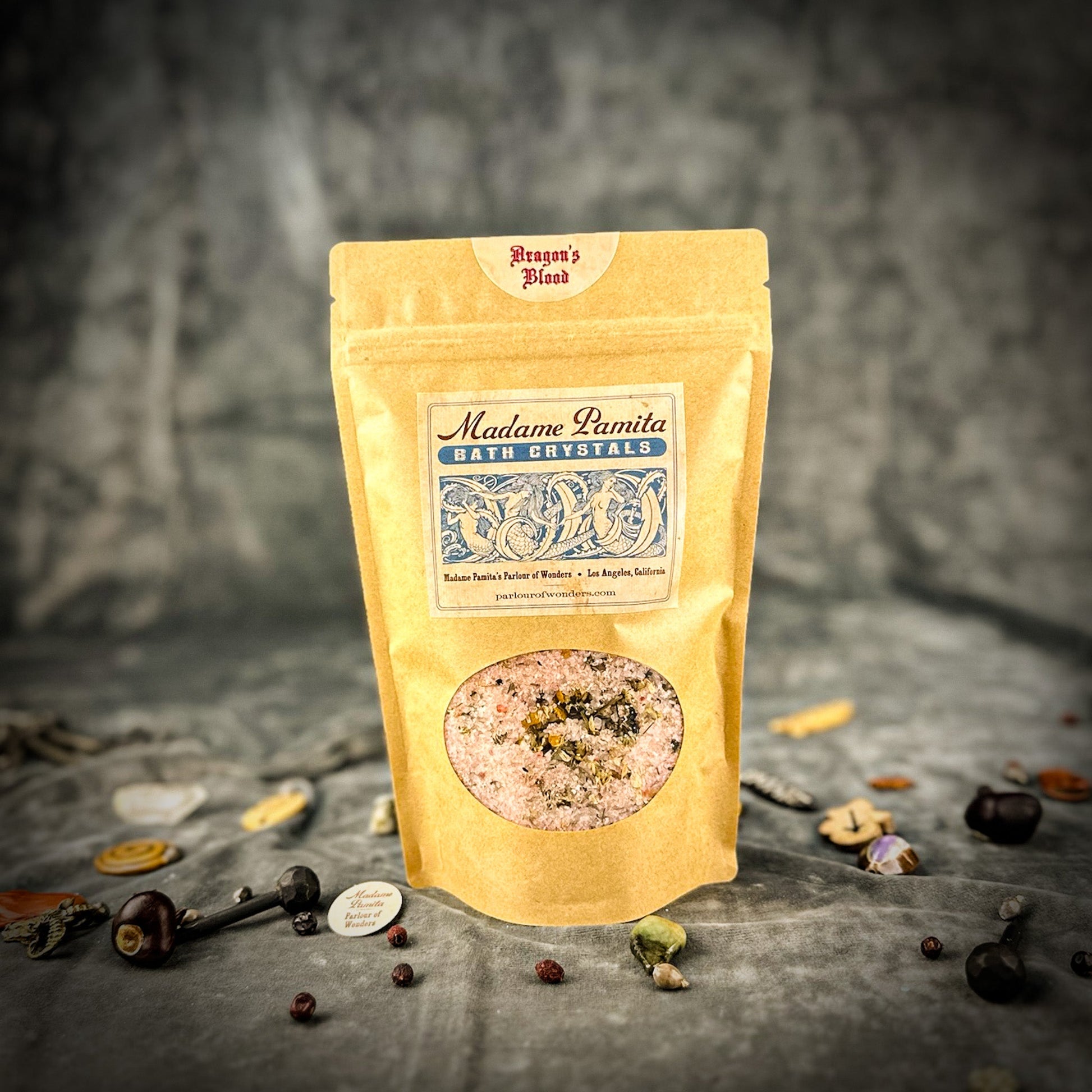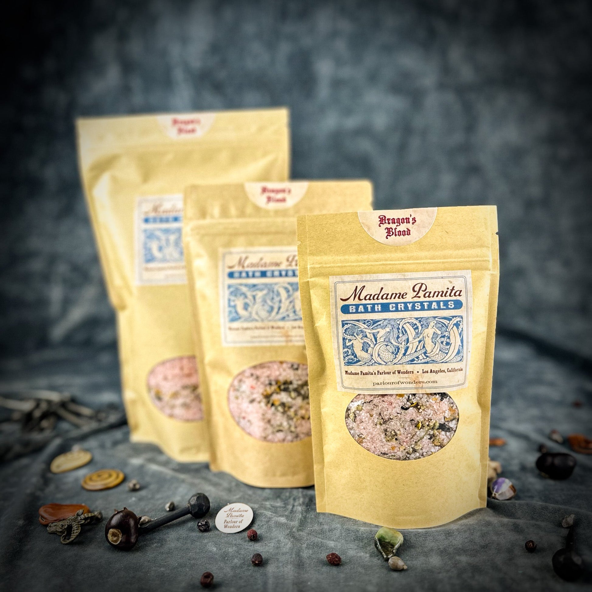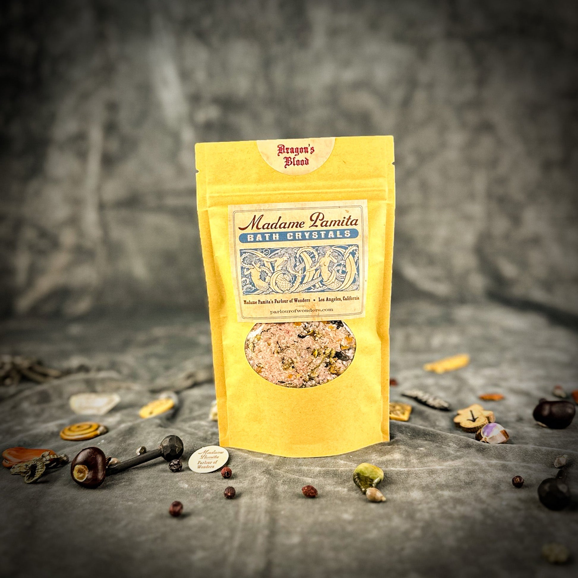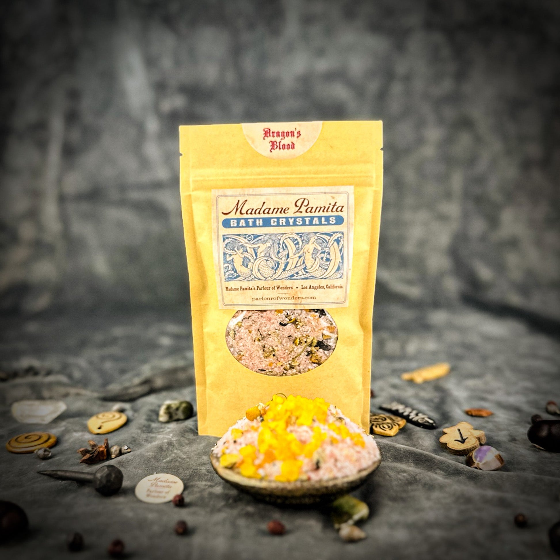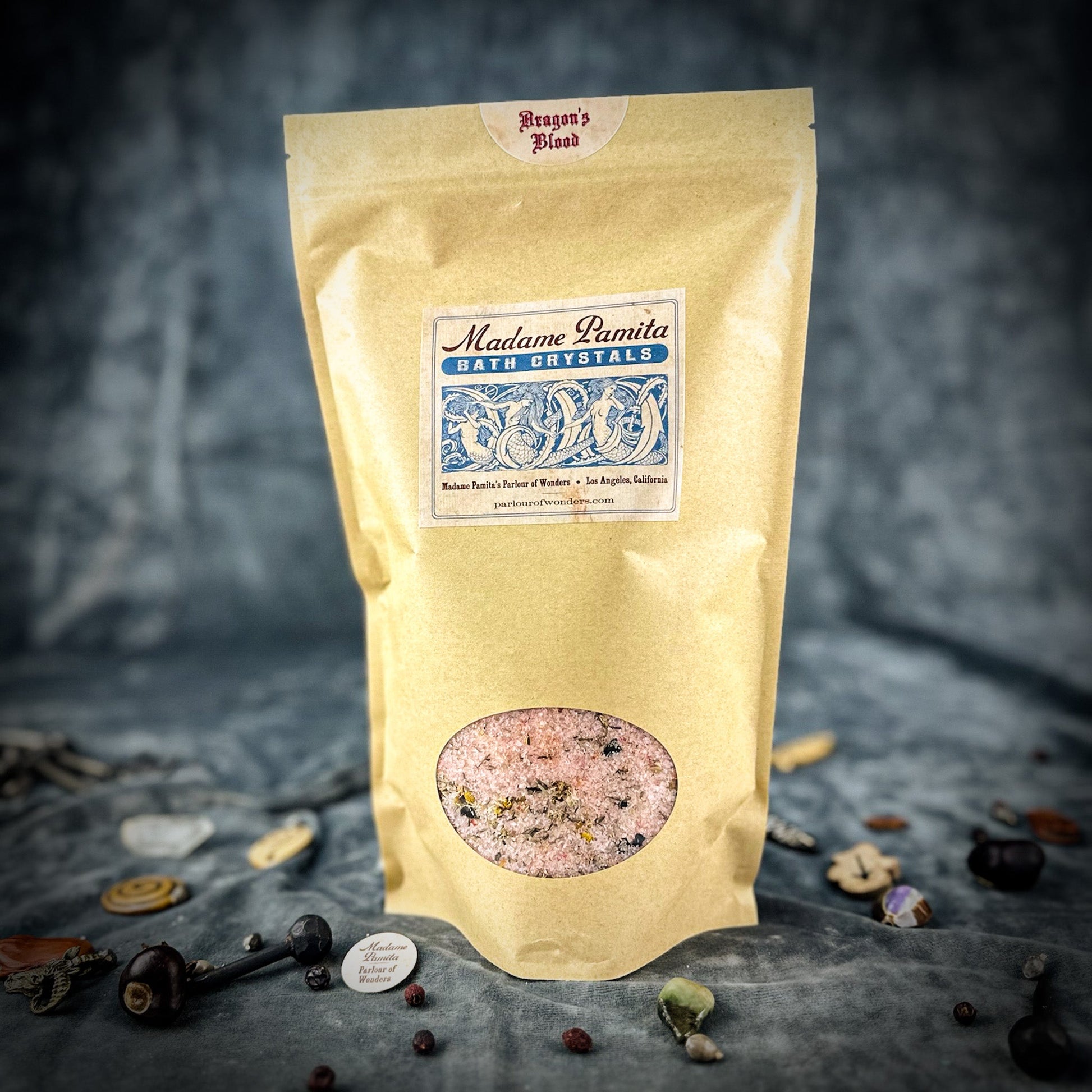 Madame Pamita Dragon’s Blood Bath Crystals are made with the finest natural ingredients, inspired by traditional rootwork and spiritual practices. Each blend includes natural sea salt, Epsom salts, organic or wildharvested herbs and botanicals, and organic essential oils, carefully formulated to support your protective rituals.