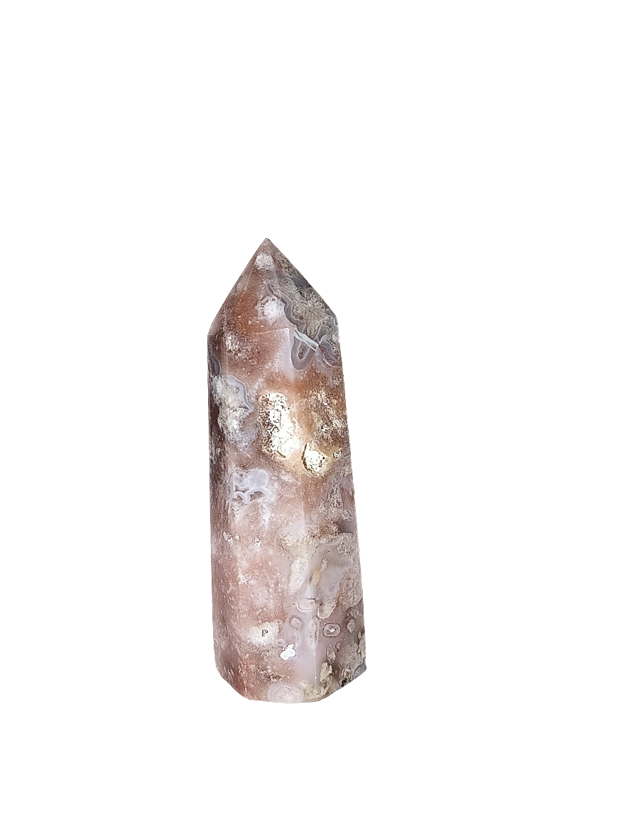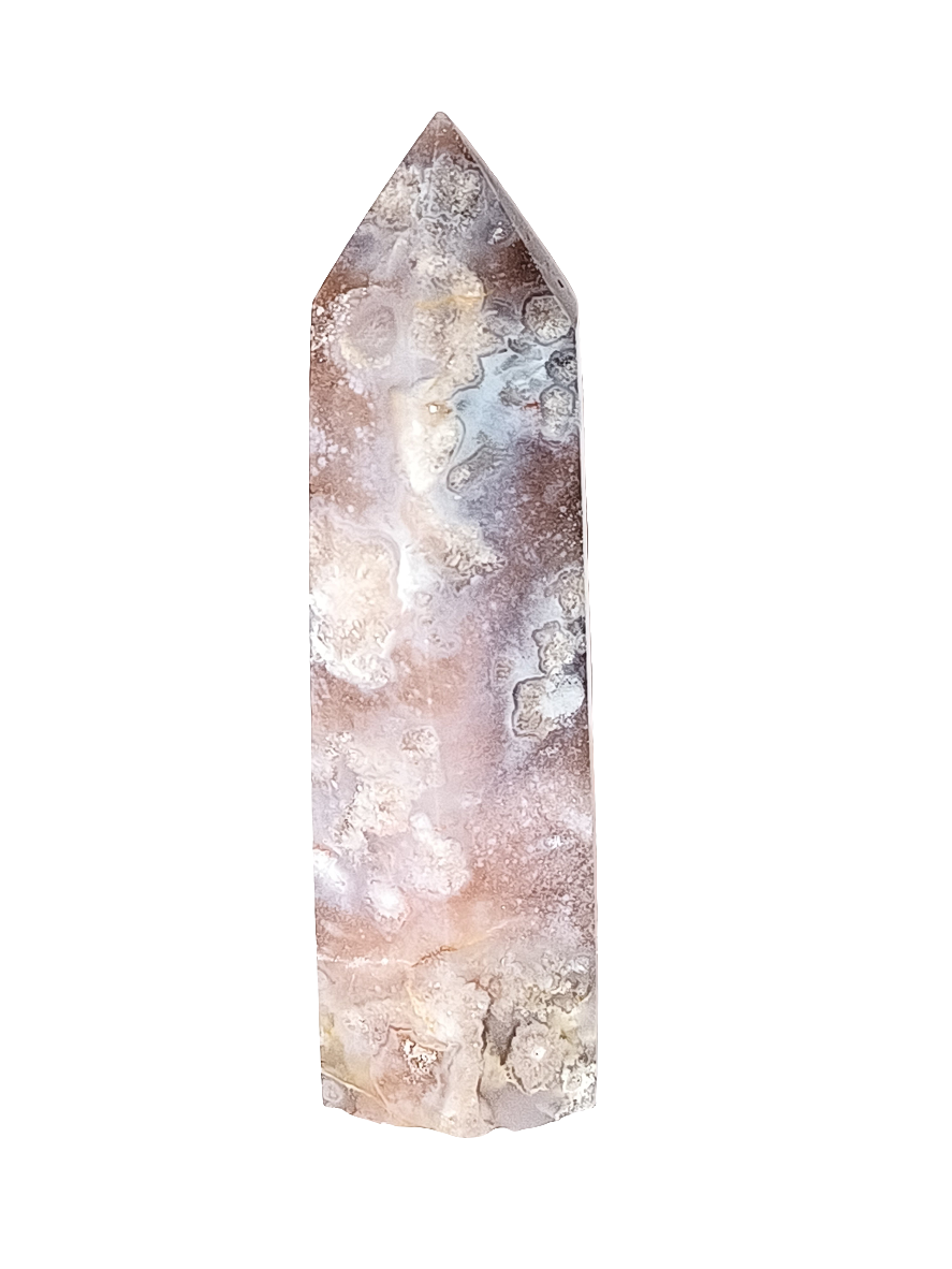 The Flower Agate Point is a powerful healing stone that works on all chakras to balance the mind, body, and spirit. It removes negative energy, allowing positive energy to flow and aiding in emotional healing. Use it during meditation to restore hope and enthusiasm.
