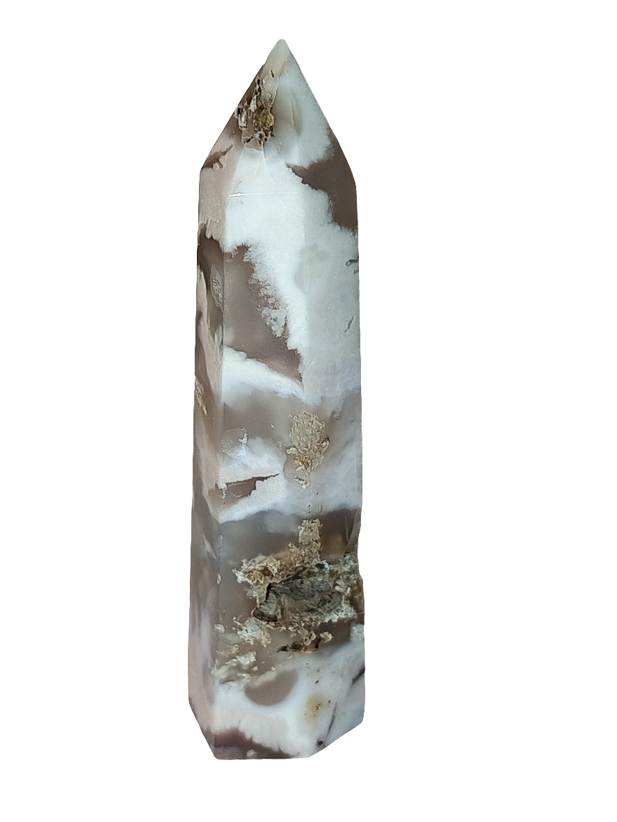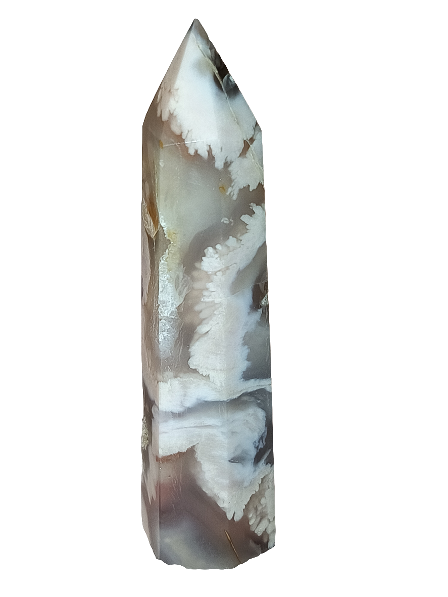 The Flower Agate Point is a powerful healing stone that works on all chakras to balance the mind, body, and spirit. It removes negative energy, allowing positive energy to flow and aiding in emotional healing. Use it during meditation to restore hope and enthusiasm.