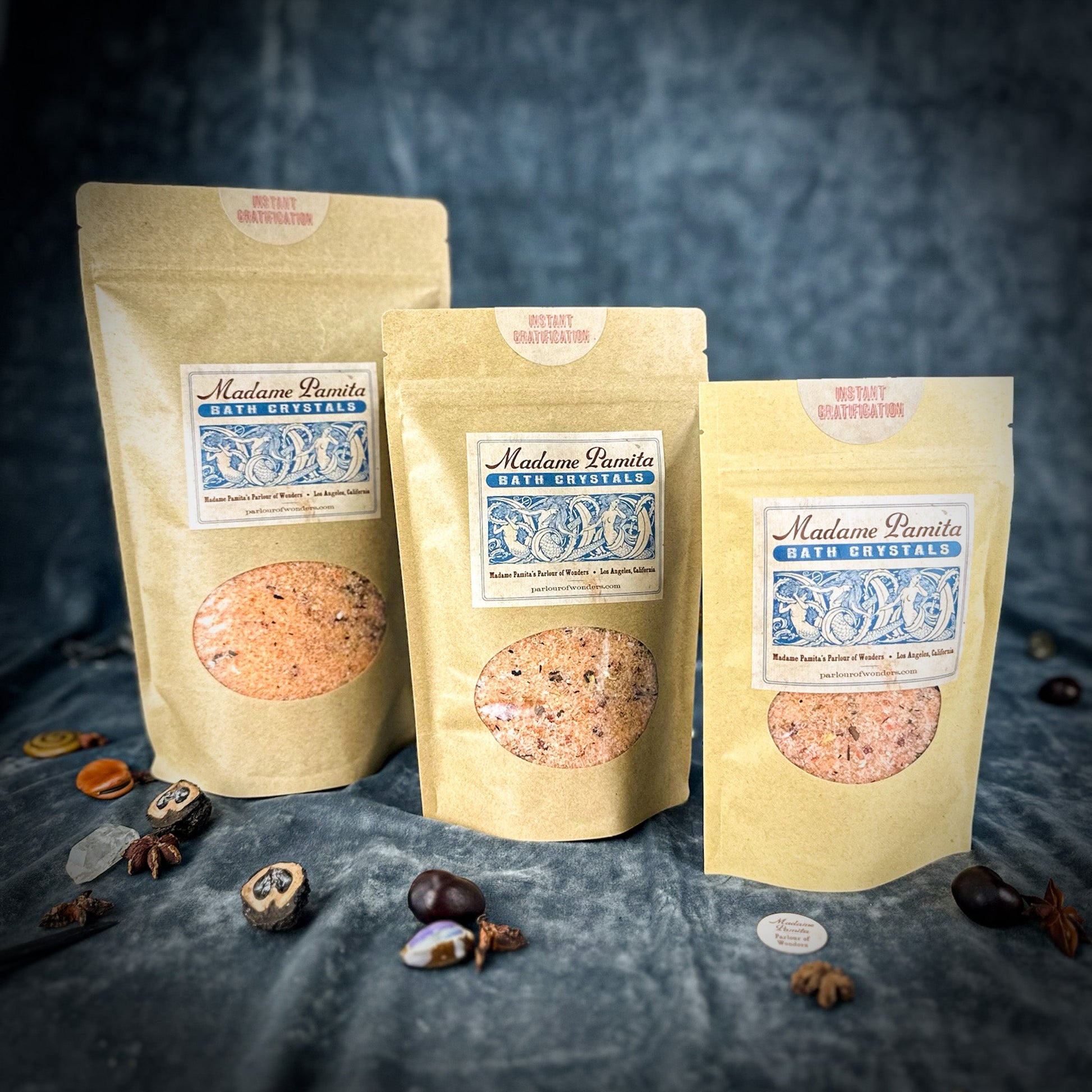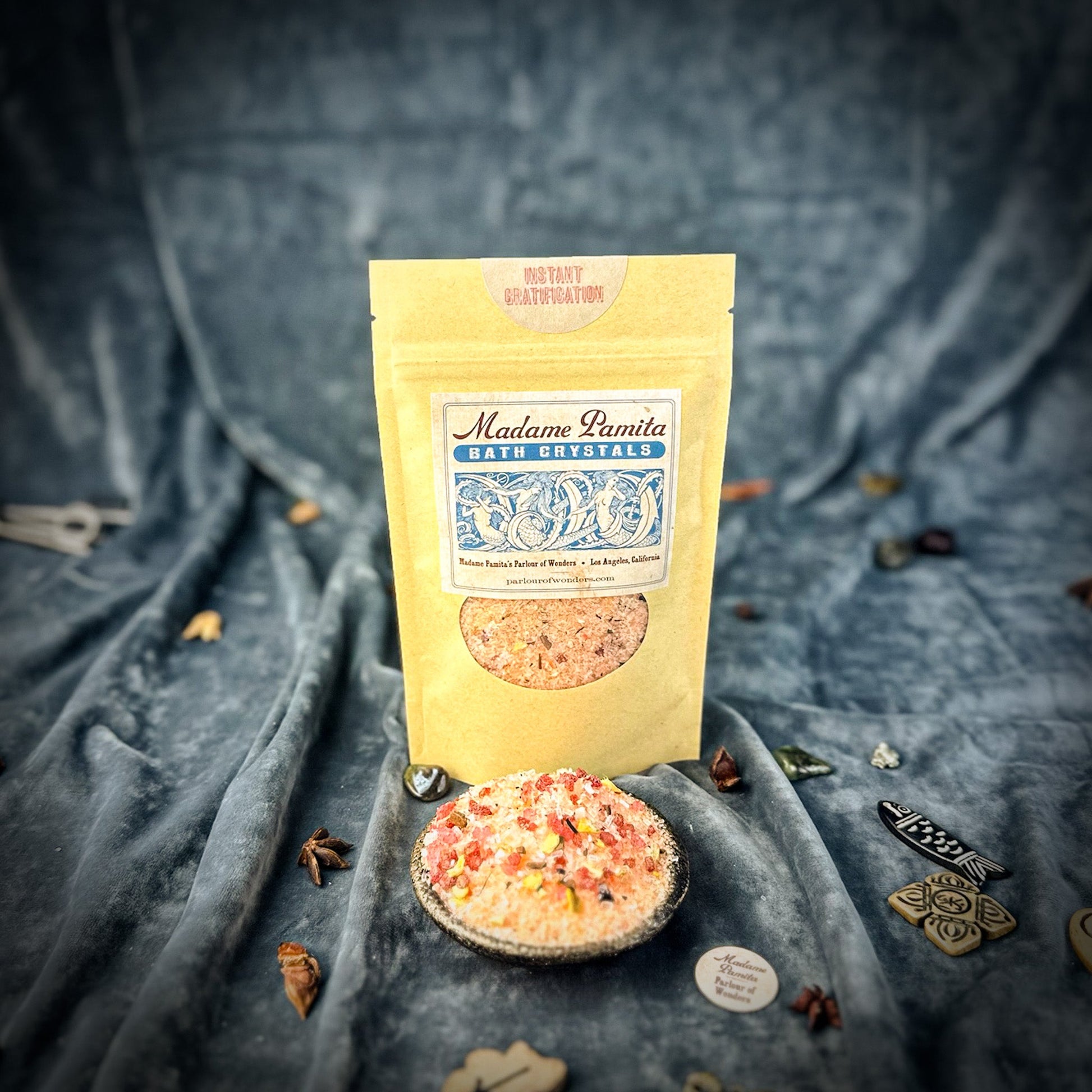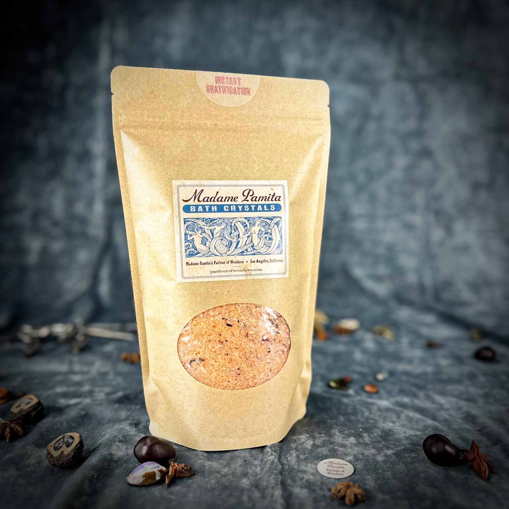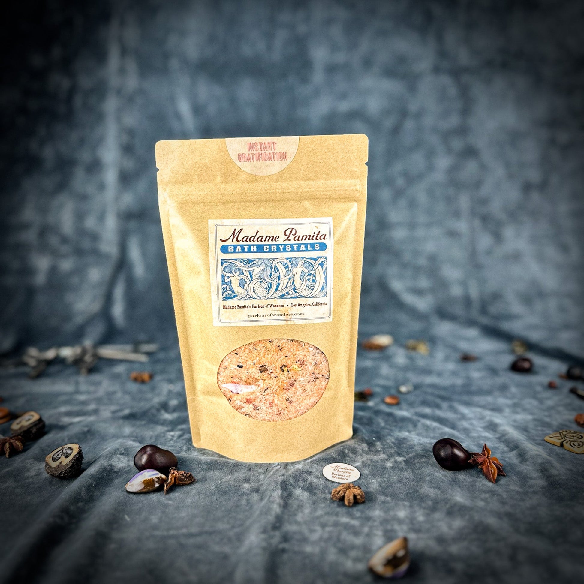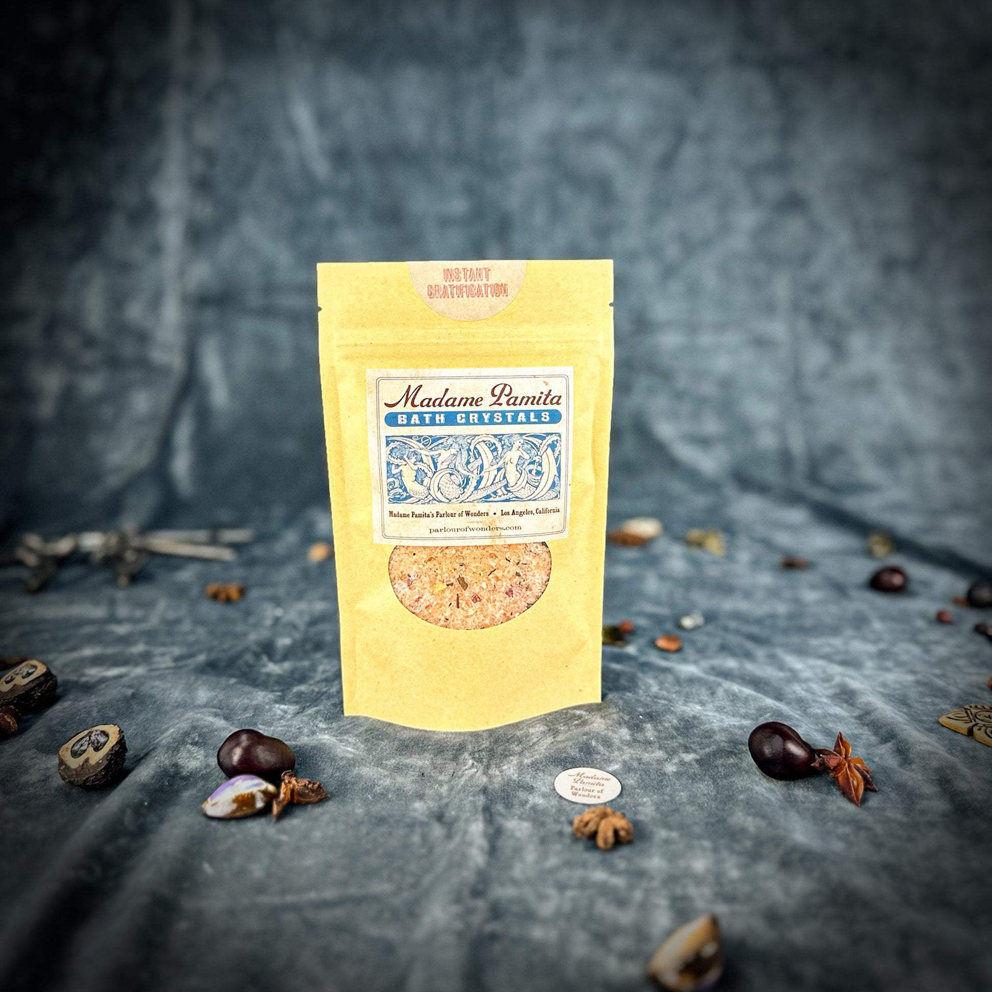 Madame Pamita’s Instant Gratification Bath Crystals are crafted with the finest natural ingredients, inspired by traditional energy work and spell practices. Each blend includes all-natural sea salt, Epsom salts, organic or wildharvested herbs and botanicals, and organic essential oils, carefully formulated to support your goals for rapid results.