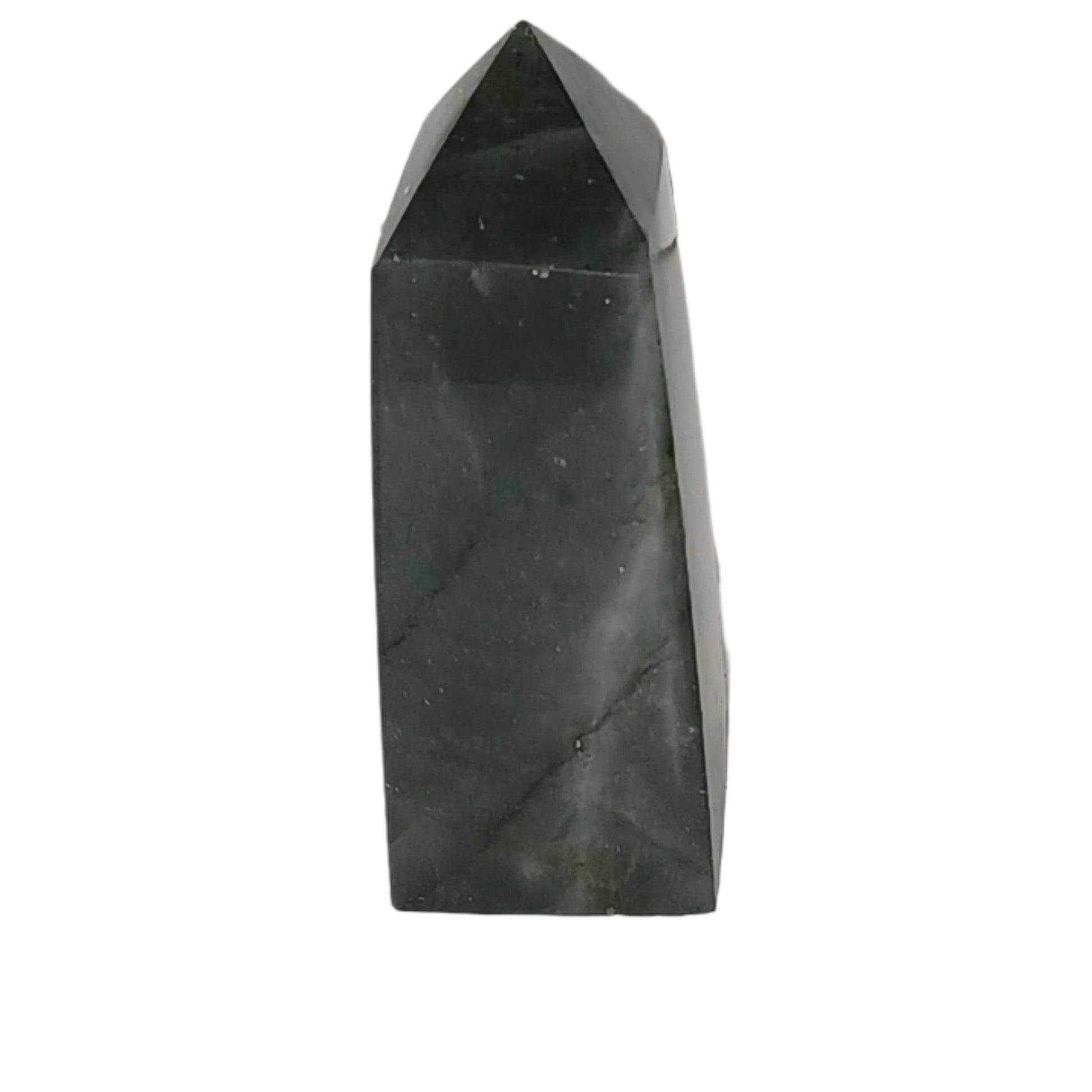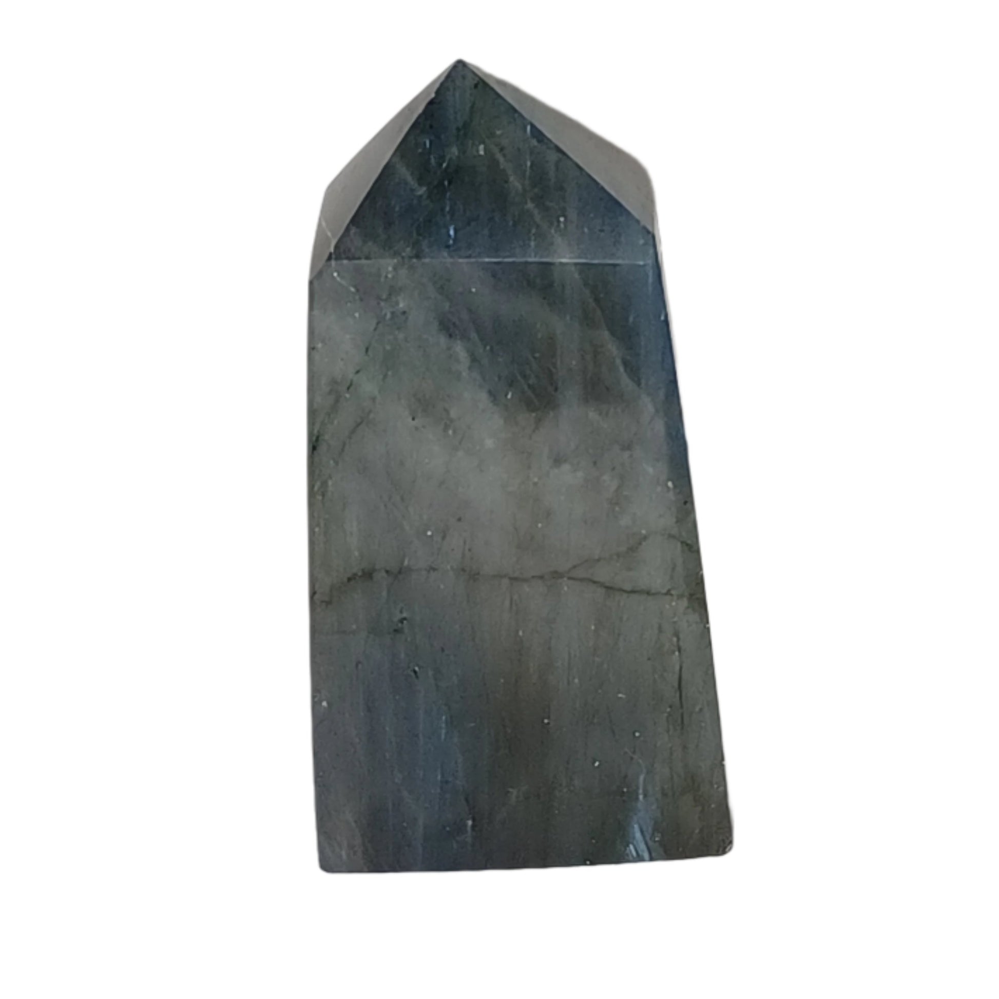 "The Labradorite Point is a unique and beautiful addition to any crystal collection. This point features a mesmerizing labradorite stone that measures 1 1/8" by 3/4" by 2 1/4" and weighs 2 1/4 oz. Its iridescent colors and distinct shape make it a standout piece, perfect for enhancing intuition and promoting positive energy."