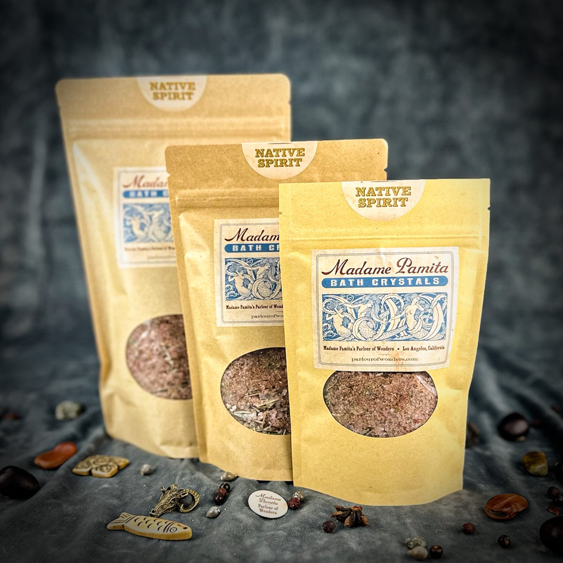 Madame Pamita’s Native Spirit Bath Crystals are crafted with the finest natural ingredients, inspired by traditional practices of honoring and connecting with the spiritual world. Each blend includes all-natural sea salt, Epsom salts, organic or wildharvested herbs and botanicals, and organic essential oils, thoughtfully formulated to support your spiritual growth and connection.
