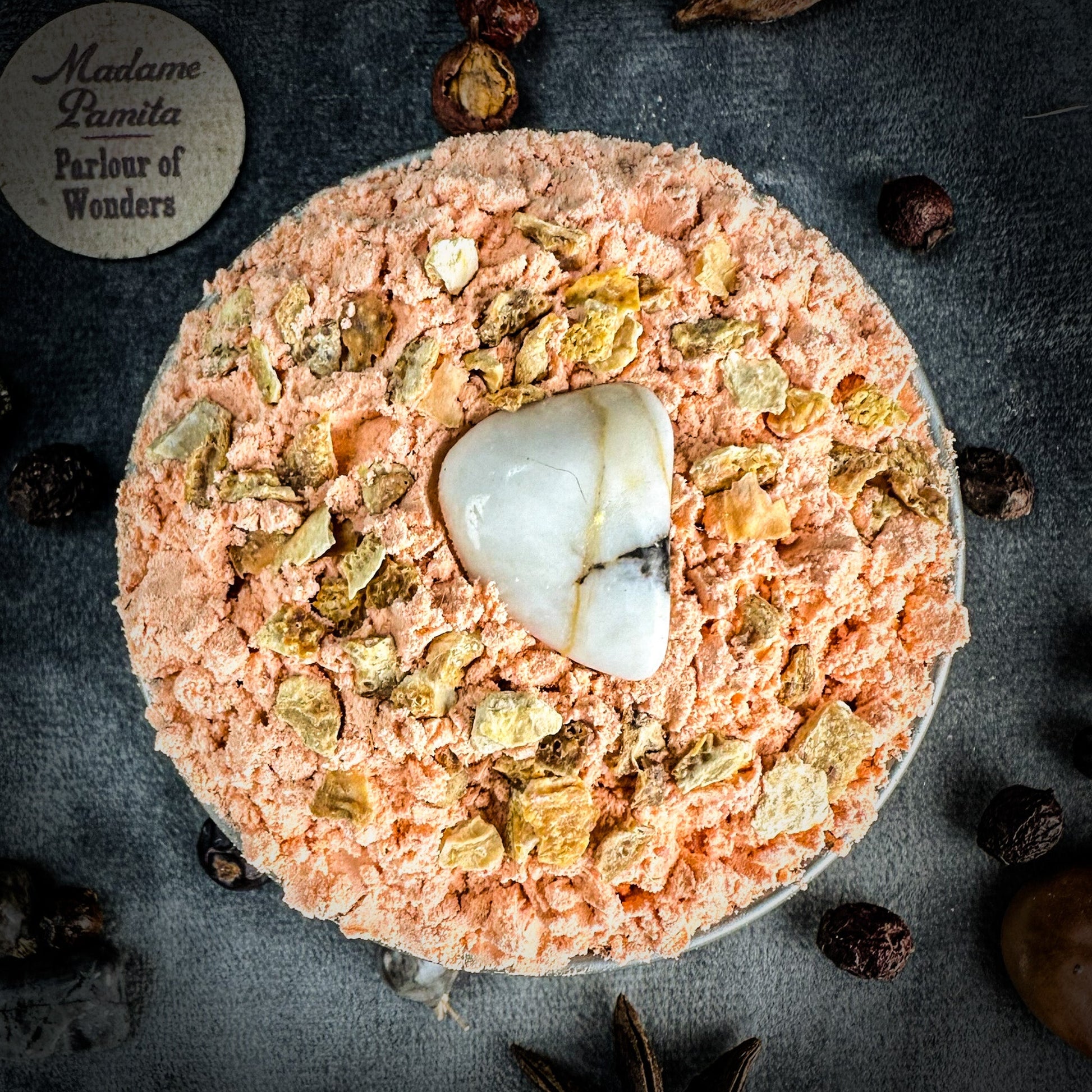 This gem-infused sachet makes an excellent substitute for spiritual oils and can be applied to your body or materials like cloth or paper without leaving an oily residue. It can also be used in candle spells as a substitute for spiritual oils. Simply apply a plain oil to a candle and sprinkle the sachet powder on and around the candle.