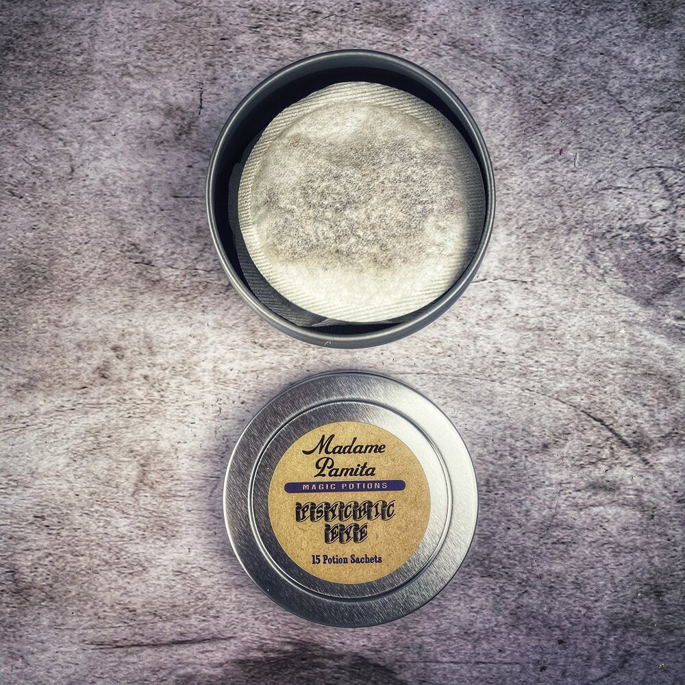 Alternatively, you may add one sachet or one teaspoon of the loose-leaf blend in an infuser to a bottle of wine or spirits and leave it to steep overnight to infuse it with psychic magic