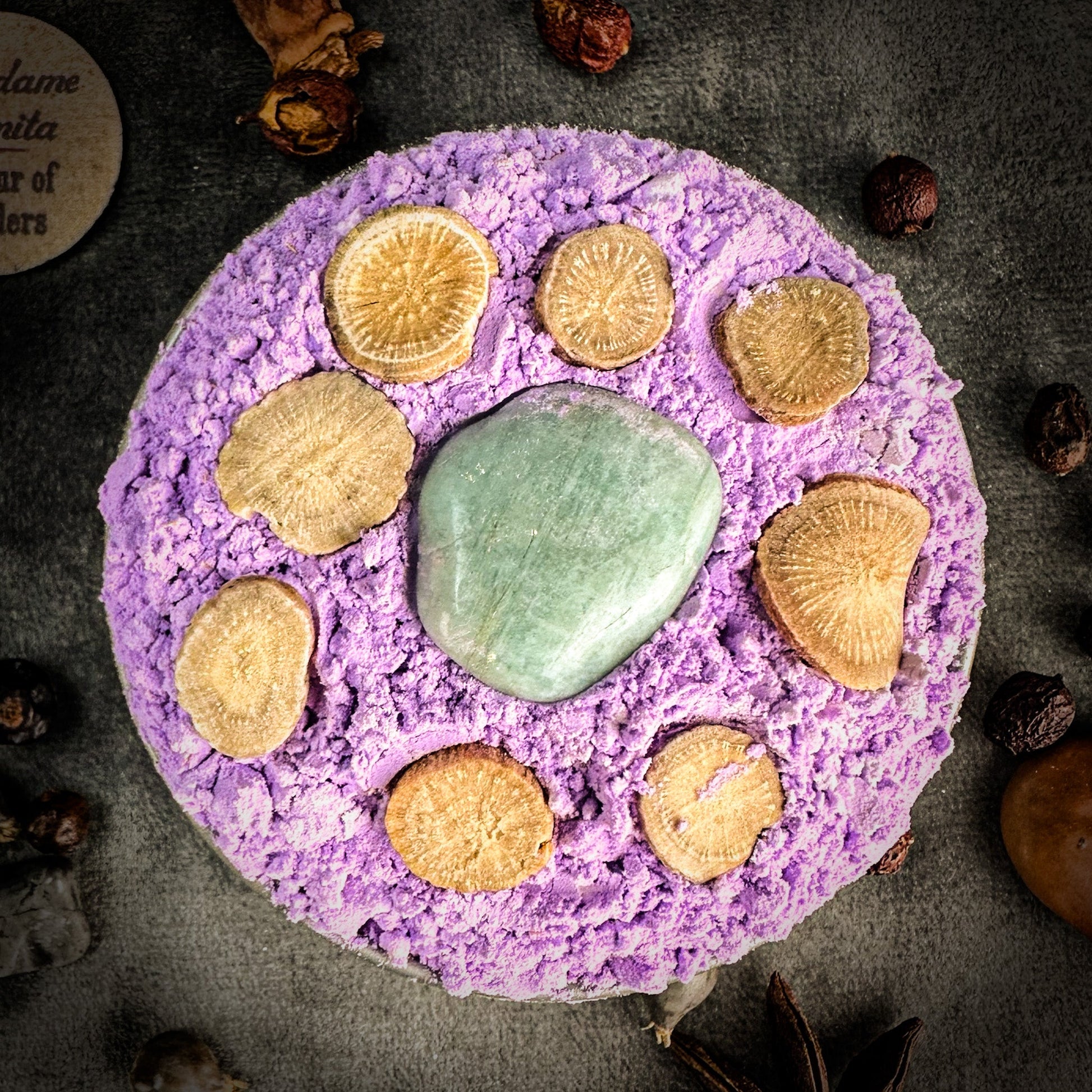 Each generous screw-top tin comes with a lucky Amazonite gemstone. Leave the gemstone in the tin until all the product is used, then place it on your altar or carry it in a mojo bag.