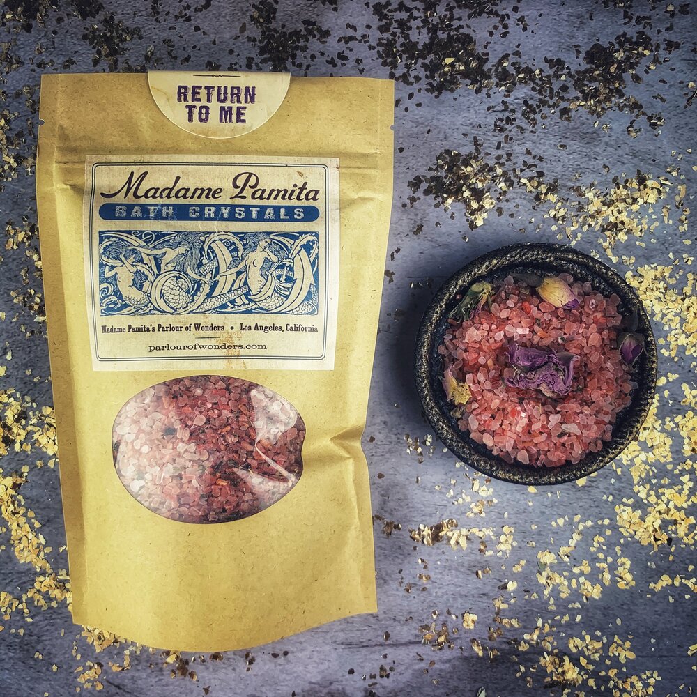 The proprietary blend of ingredients in Return to Me Bath Crystals include Rose Petals to bring back affectionate and loving feelings, the warming scent of Benzoin oil for smoothing over arguments and other herbs and oils to draw a lover, relative or friend back into your life.