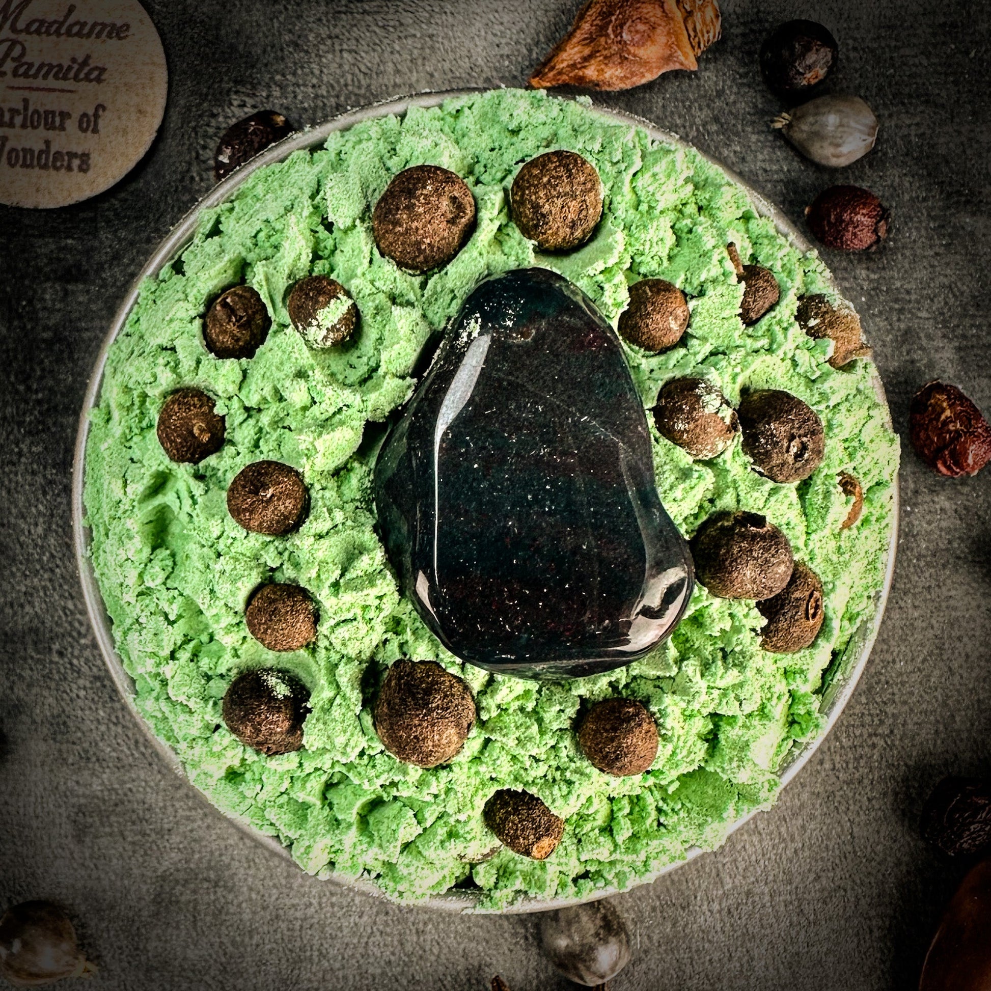 Each generous tin comes with a sparkling Fancy Jasper gemstone. Leave the gemstone in the tin until all the product is used, then place it on your altar or carry it in a mojo bag.