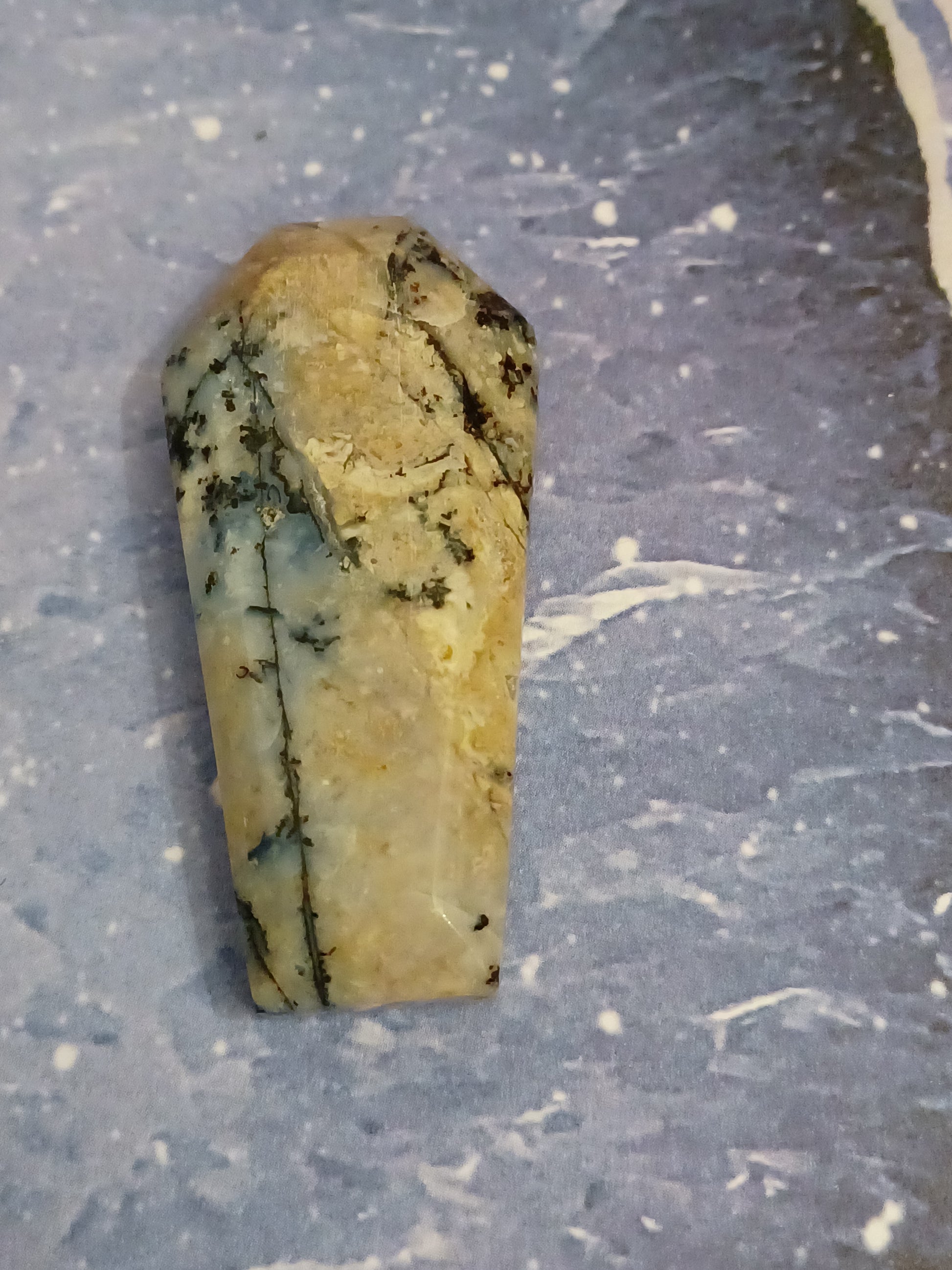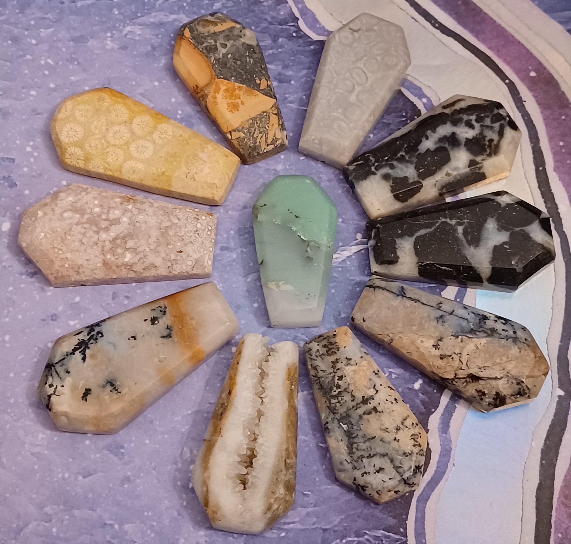 Brecciated Jasper, Zebra Marble, Dendritic Agate, Agatized Coral, Flower Agate, Quartz, and Green Chalcedony.