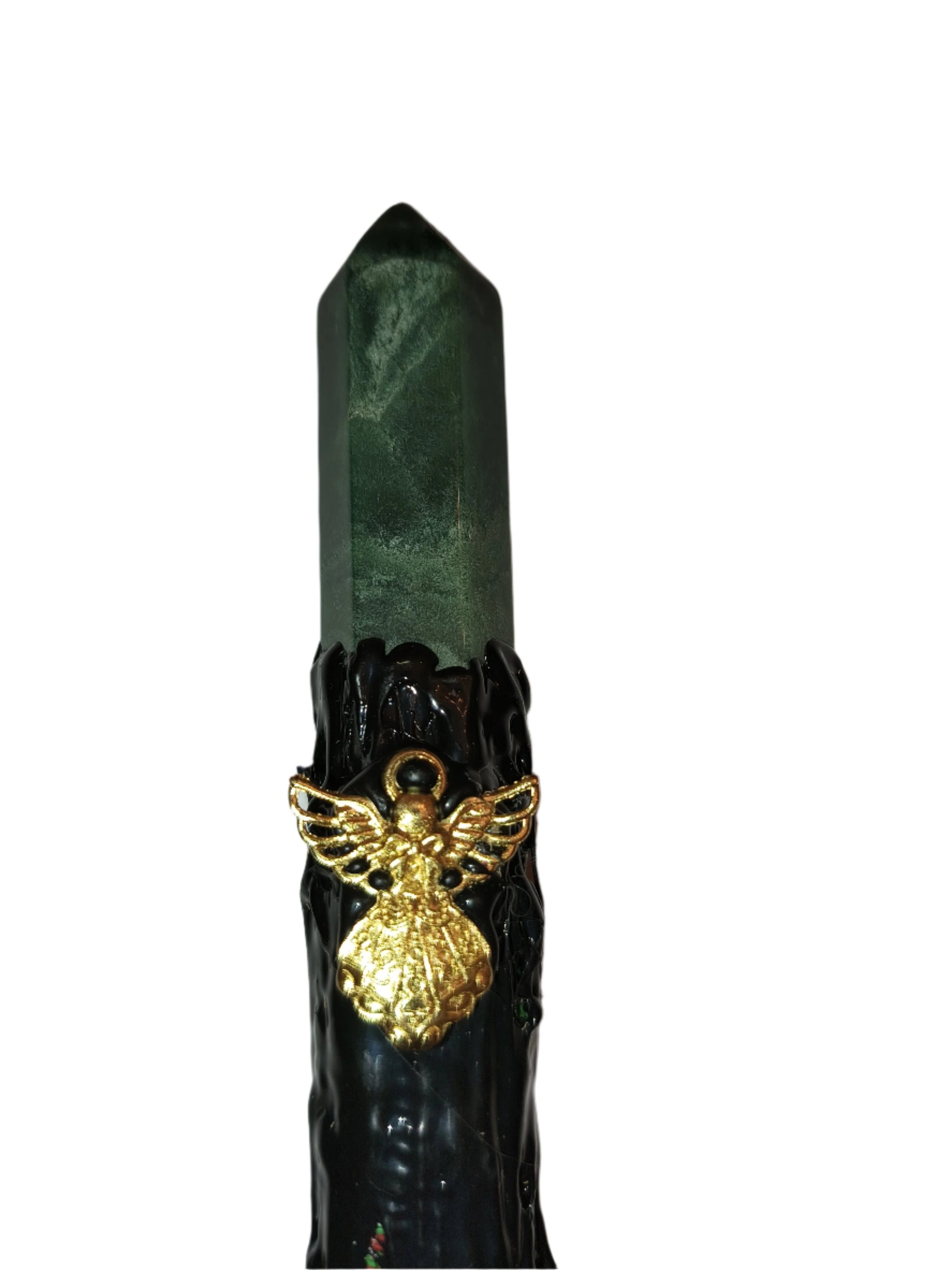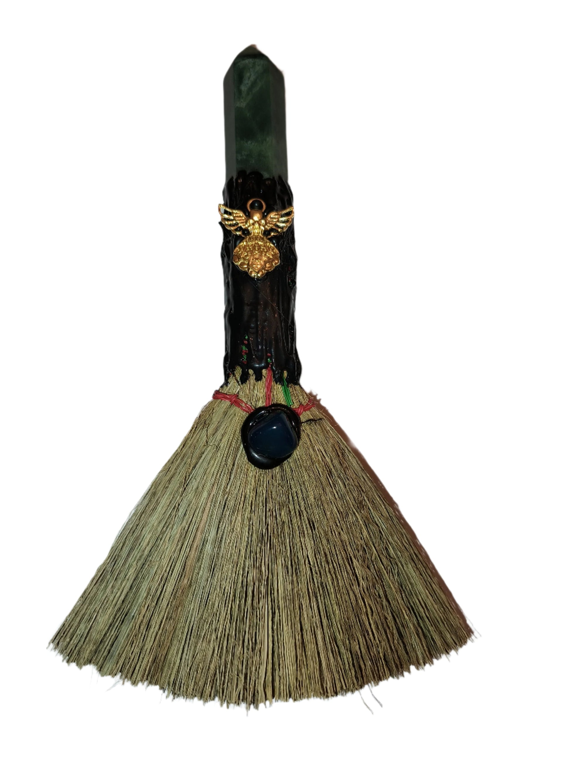 As a trusted tool for centuries, our Witch Broom features an Angel design, measuring at 8" x 4 1/2". Made with a Green Aventurine Point at the top, this broom is known for its energy-amplifying that can aid in manifestation. It is often considered a good luck stone as it may help attract prosperity and good fortune. It enhances creativity and strengthens leadership skills. It is often used as a mood booster that can contribute to better vitality and happiness. making it a unique and powerful addition to your collection. 2 1/2 oz.