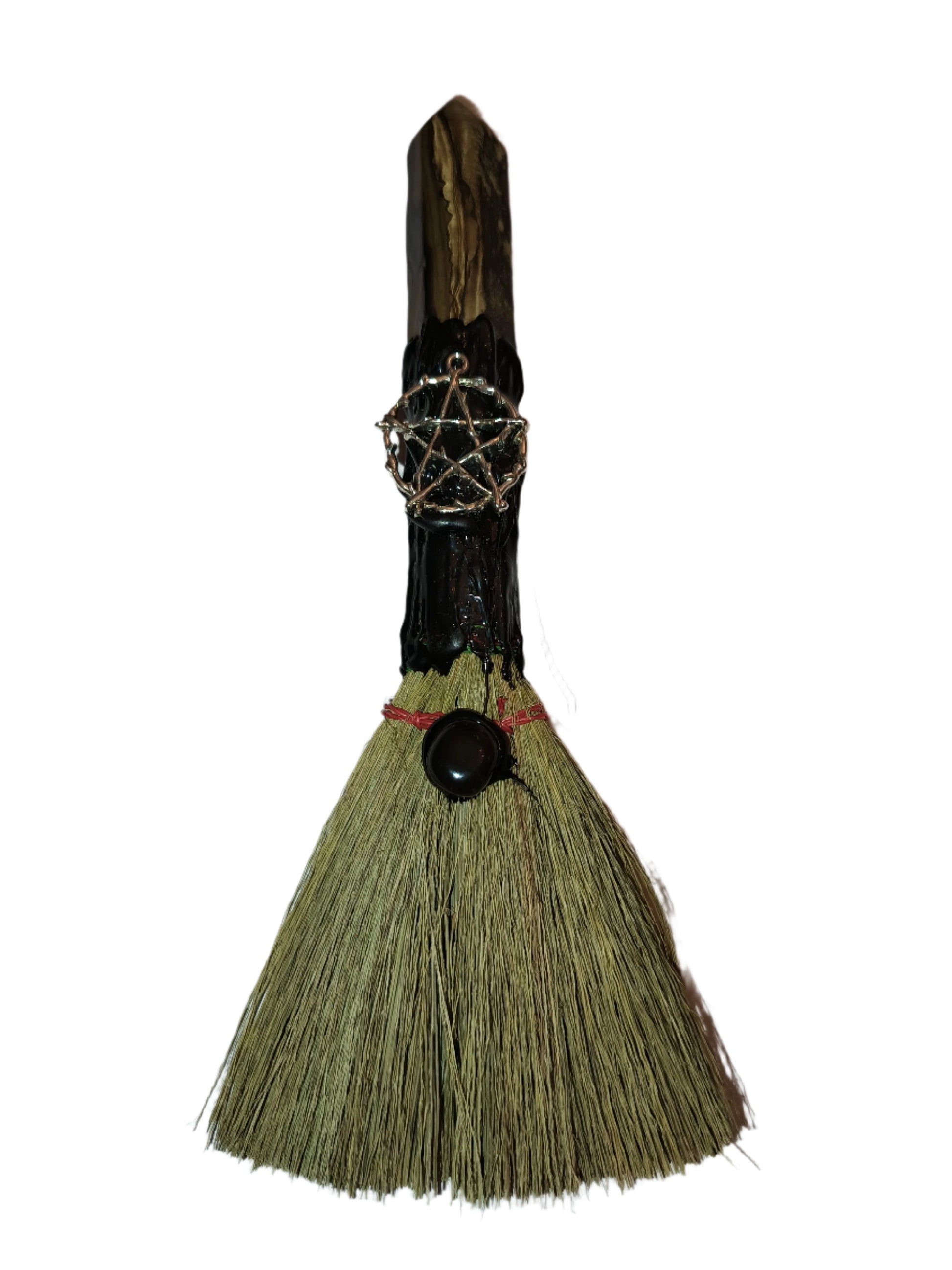 As a trusted tool for centuries, our Witch Broom features a pentagram charm, measuring at 7 1/2" x 3 1/2". Made with a Tiger Eye Point at the top, this Stone is said to boost energy and increase bravery, thus helping combat lethargy and fear. This crystal is also thought to help balance emotions and create positive energy. It is believed to clear root chakras whilst enhancing sacral and solar plexus chakras, making it a unique and powerful addition to your collection. 2 1/4 oz.
