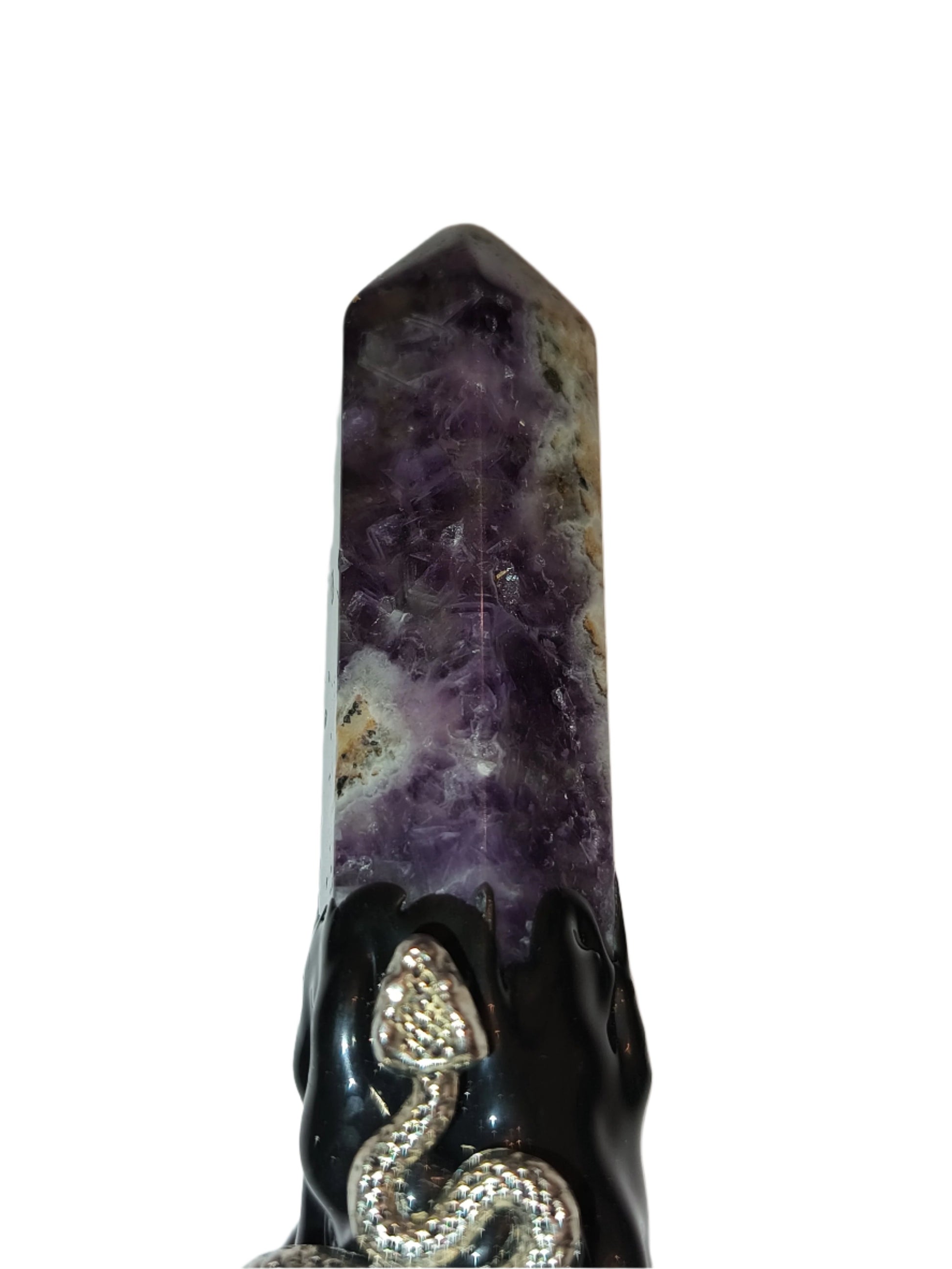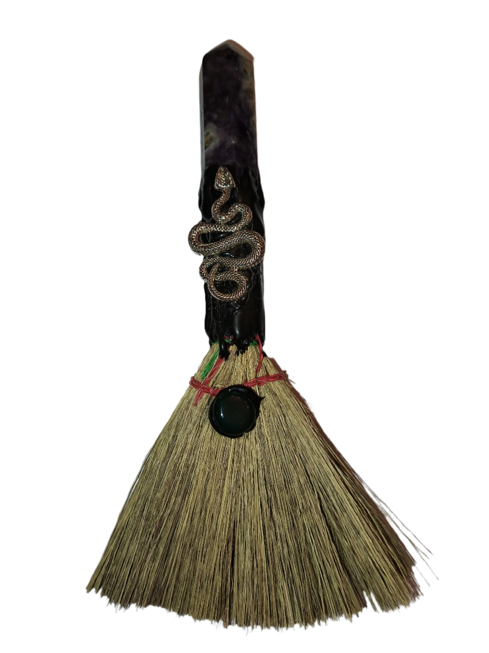 As a trusted tool for centuries, our Witch Broom features a snake charm, measuring at 8" x 4". Made with an Amethyst Point at the top, this broom is known for its healing for the spiritual and emotional body. Its positive energy forces remove negative energy, making it a unique and powerful addition to your collection. 2 1/2 oz.