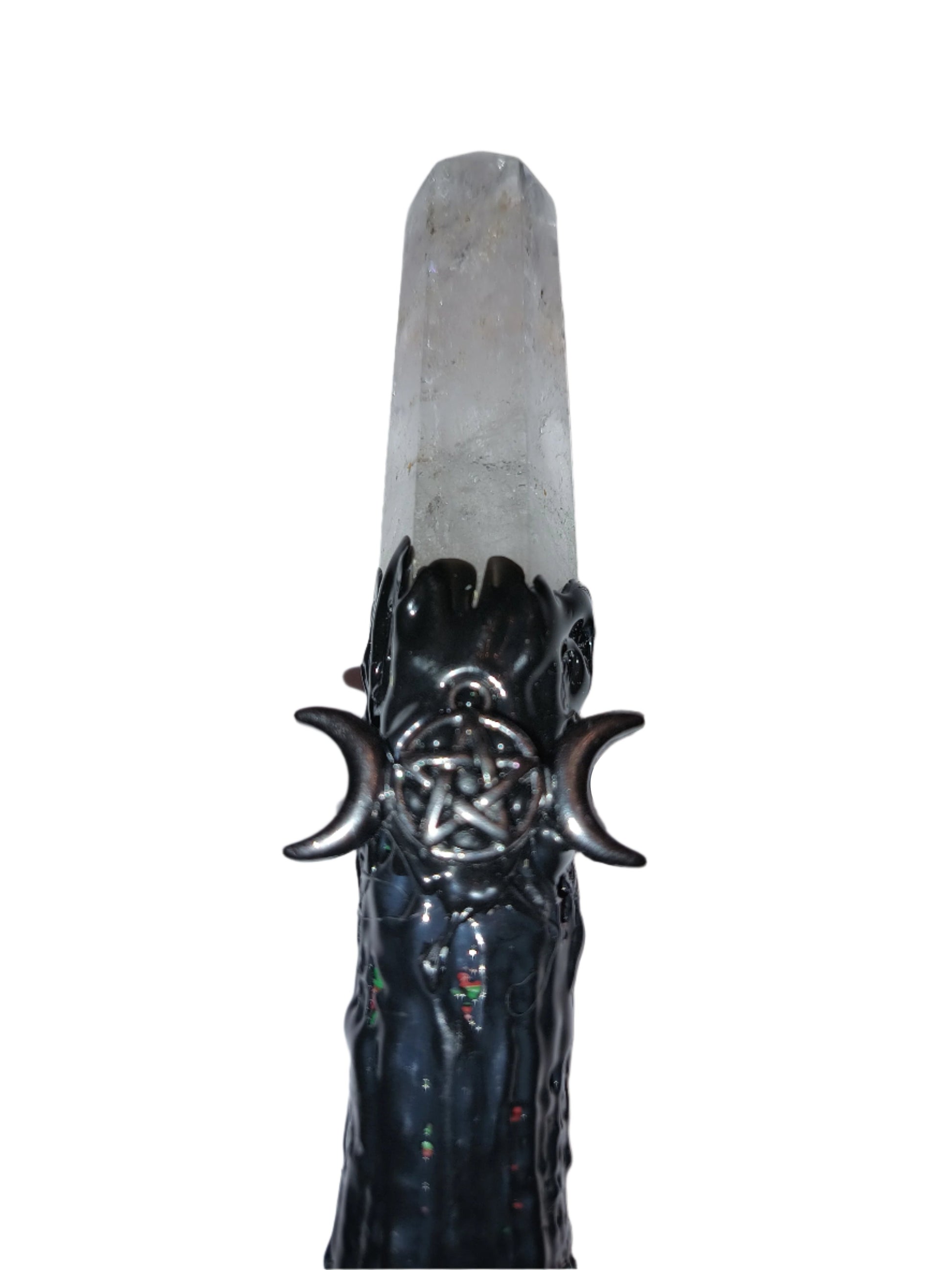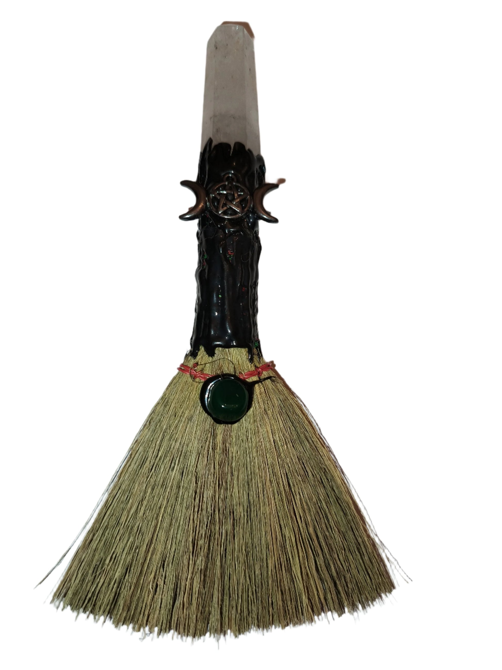 As a trusted tool for centuries, our Witch Broom features an Triple Moon design, measuring at 7 1/2" x 3 1/2". Made with a Quartz Crystal Point at the top, this broom is known for its grounding and protective benefits, making it a unique and powerful addition to your collection. 2 oz.